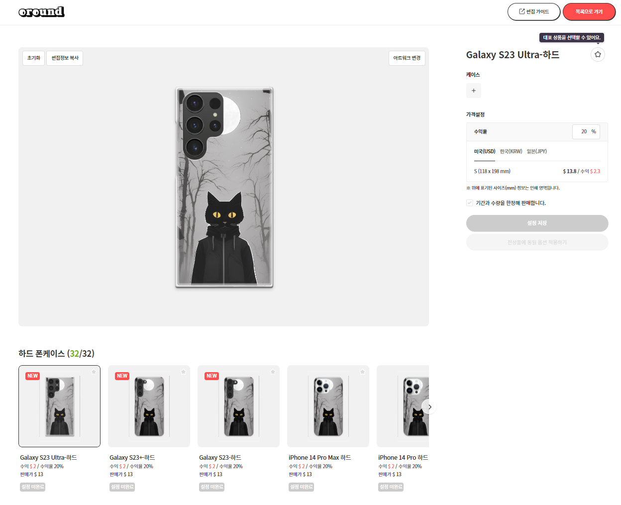플레이그라운드에서 만든 고양이 이미지를 가지고 판매를 할 수 있도록 핸드폰 케이스 디자인을 해봤습니다