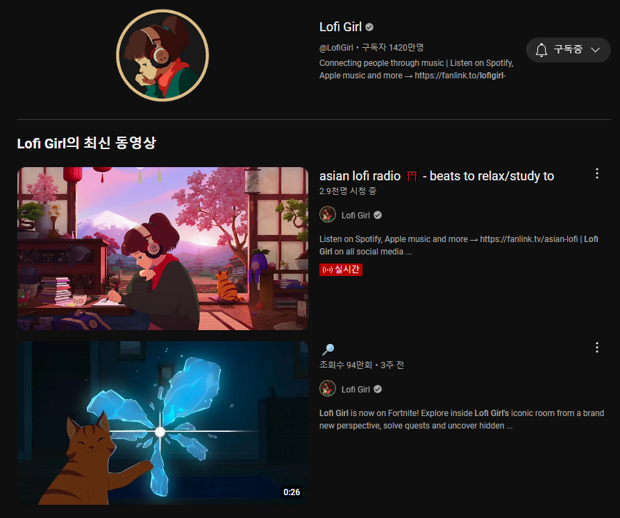 하나의 예를 들어보면 Lofi Girl(구 ChilledCow)은 lofi 음악 스트리밍 채널로, 부업으로 이를 소개하는 영상이 적잖이 있습니다. 쉽게 생각하지만 이는 이 분의 노력과 마케팅 능력을 오히려 폄하하는 부분이 없지않아있습니다.
