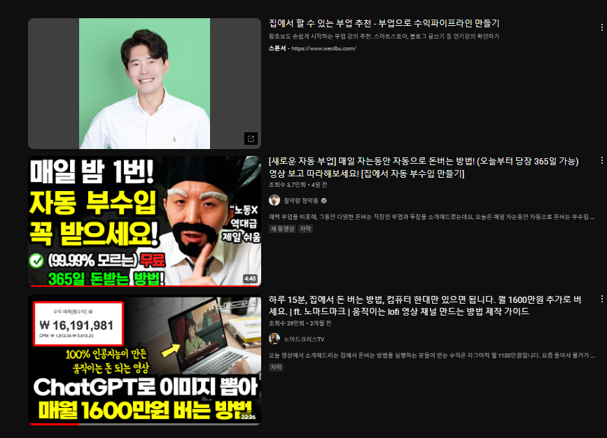 그러다보니 유튜브 영상에서는 돈을 쉽게 버는 방법에 대해 영상이 참 많습니다.