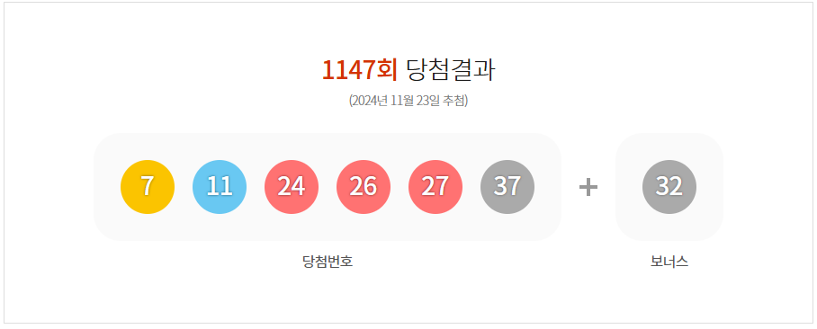 최근 발표된 제1147회 로또의 당첨번호는 '7, 11, 24, 26, 27, 37'입니다. 또한 보너스 번호는 '32'로 알려졌습니다. 이번 회차에는 총 8명이 1등에 당첨되었다고 하며, 이들은 각각 약 33억 원의 상금을 얻게 됩니다. 이렇게 큰 상금이 주어지는 만큼, 로또를 구매하는 많은 사람들의 기대감이 높아지는 이유입니다.
