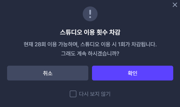 이떄 횟수 차감에 대한 경고창이 뜨는게 하루 30회의 음악을 수정하고 다운 받을 수 있는 것이다