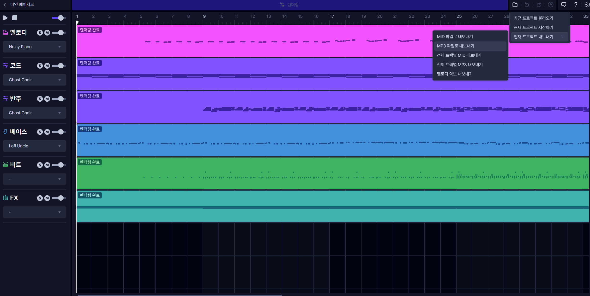 아래의 이미지를 보면 현재프로젝트를 내보내기하여 MP3파일로 받아서 사용하면 되고 그 밖에 트랙별로 저장을 따로 할 수도 있고 악보르 저장 할 수도 있다