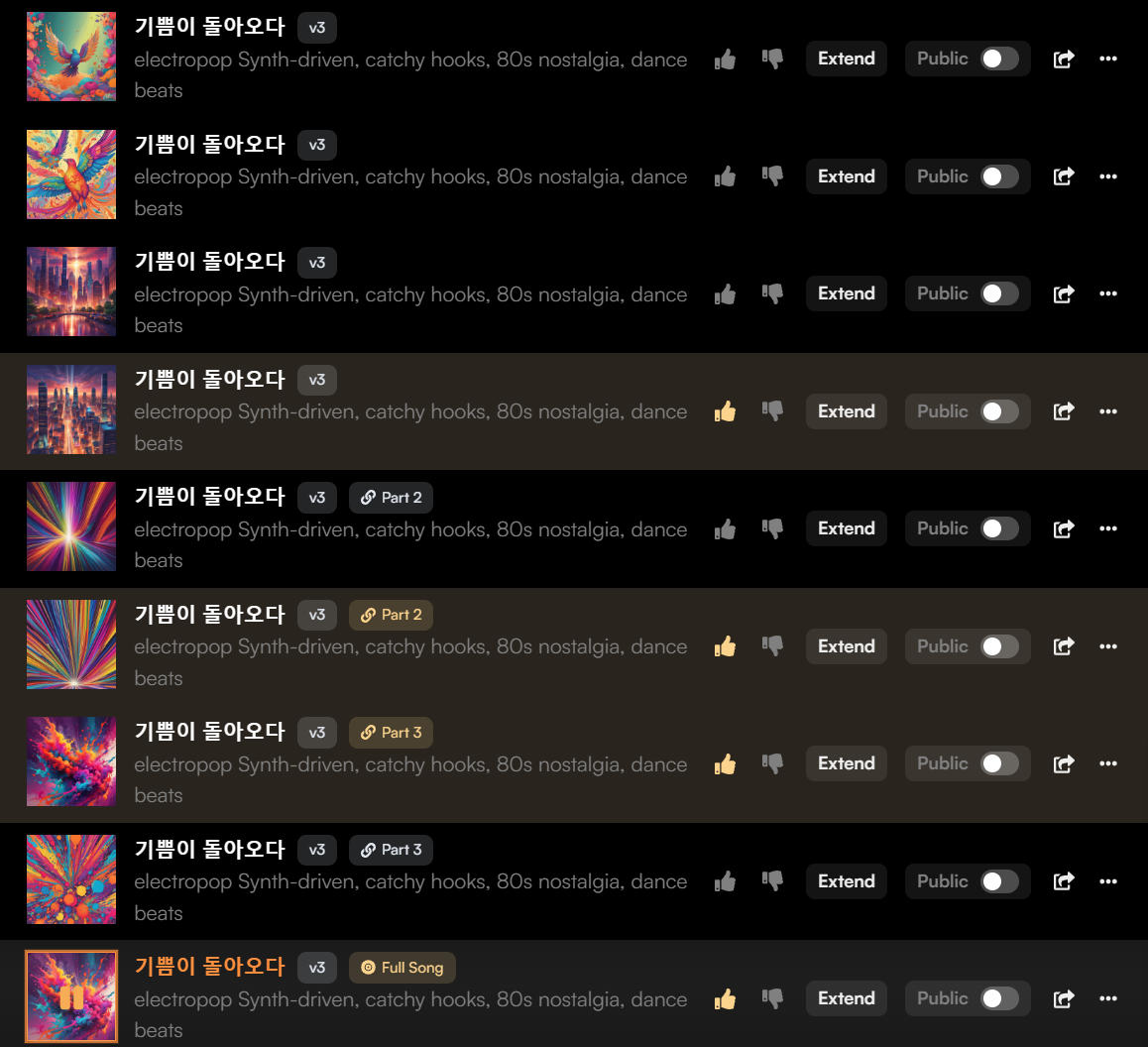 좀 바뀐 부분이 하나 더 있는데 오른쪽 옵션에서 Extend로 했던 부분이 버튼으로 생성되서 버튼을 눌러 바로 다음 노래를 만들기 편하게 되었어요