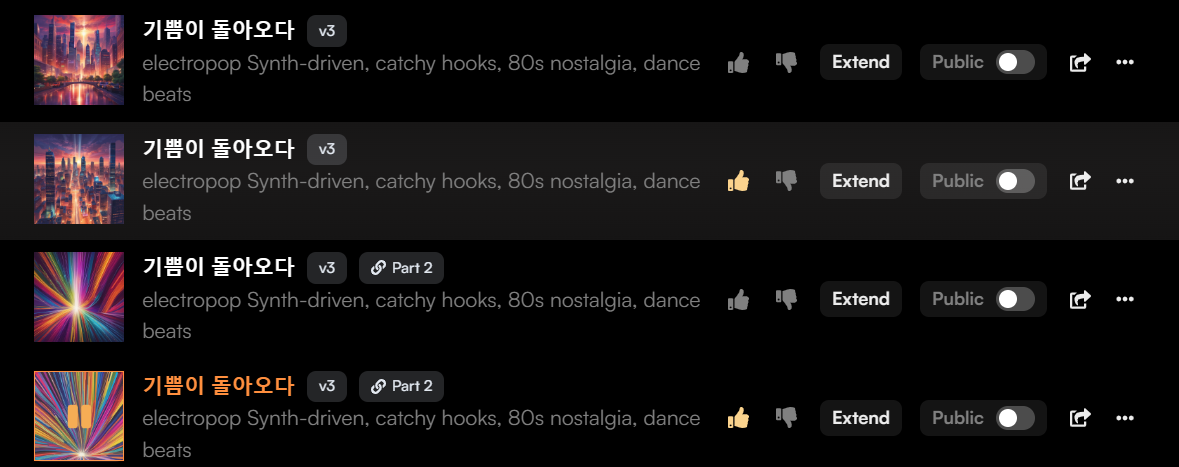 좀 바뀐 부분이 하나 더 있는데 오른쪽 옵션에서 Extend로 했던 부분이 버튼으로 생성되서 버튼을 눌러 바로 다음 노래를 만들기 편하게 되었어요