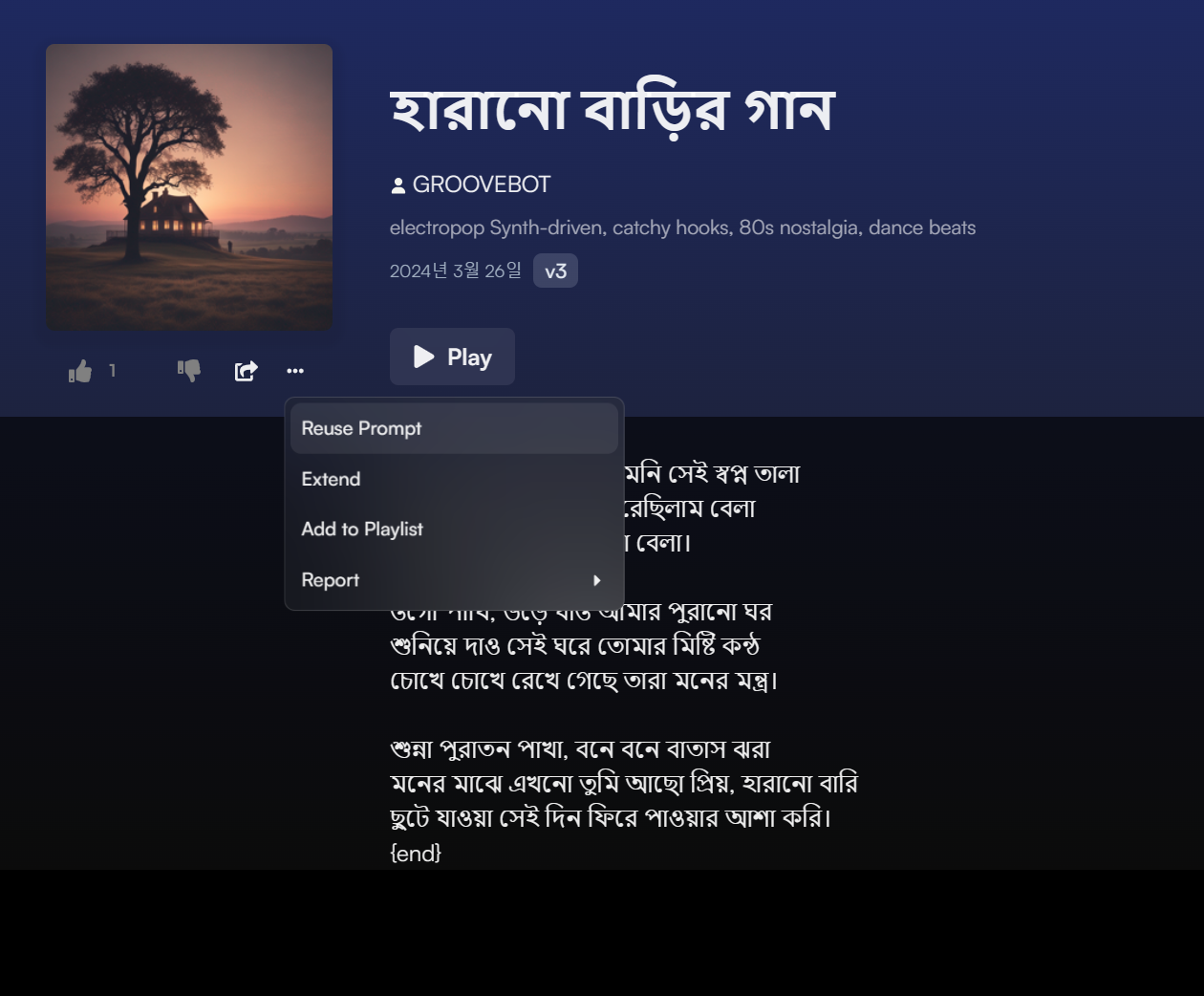 Reuse Prompt로 노래의 프롬프트를 세팅할 수 있습니다