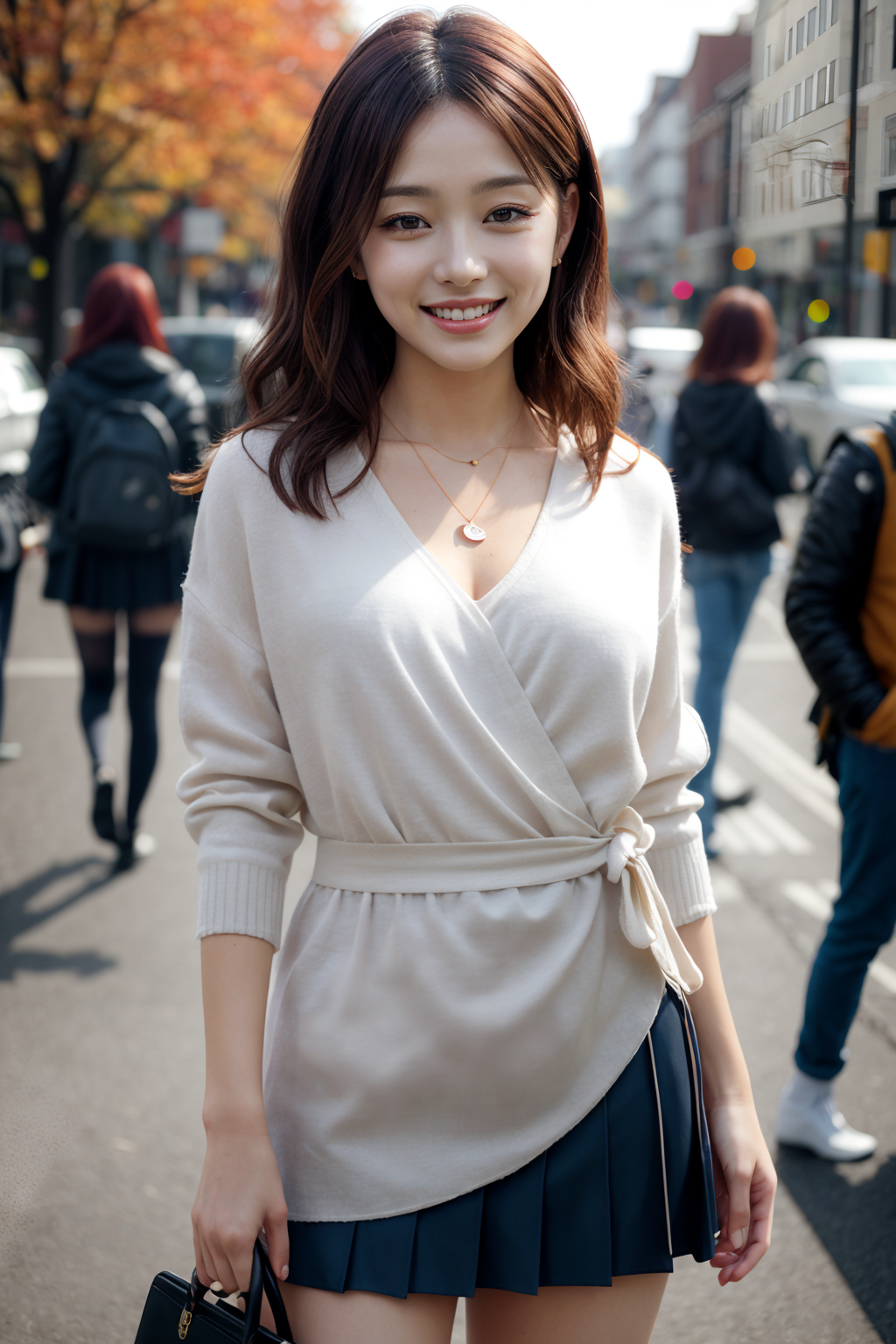 best quality, high quality, masterpiece, ((depth of field)), ((1girl)),beautiful,head to thighs, long hair, ((wavy hair)),curvy, large breasts, ((city street)), sunny, ((autumn)), cinematic lighting, sun light, happy512, smile512 <lora:cutieMixGirl_V1:0.2>, (Wrap blouse, short skirt, espadrilles, pendant necklace),korean,idolmaster,