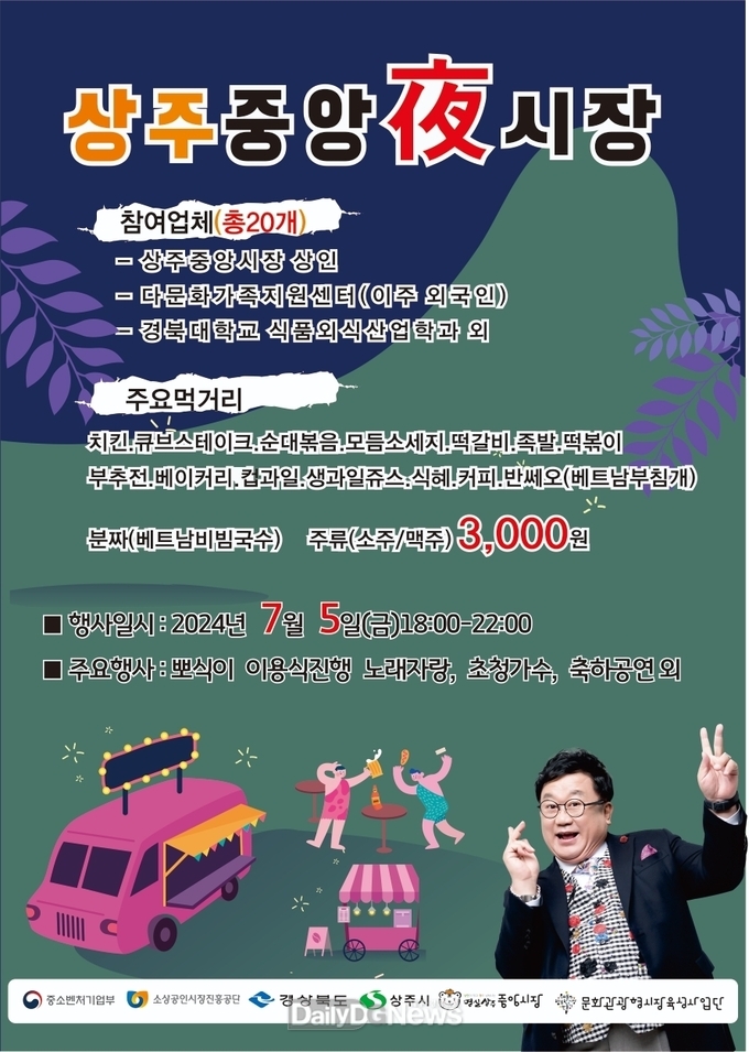 상주 중앙시장(회장 김정호)은 2024년 문화관광형시장 2년차 사업의 일환으로 무더운 여름 전통시장 상권 활성화를 위해 7월 5일(금) 18시부터 22시까지 ‘상주 중앙시장 야(夜)시장 행사’를 개최합니다.