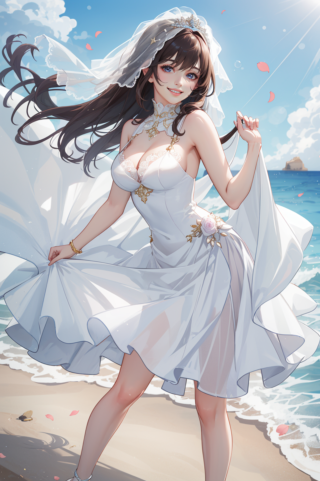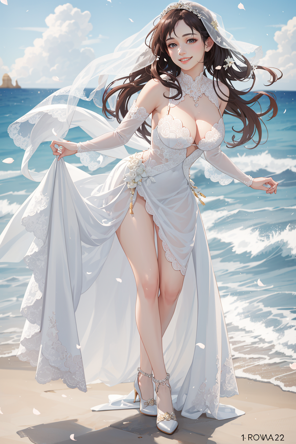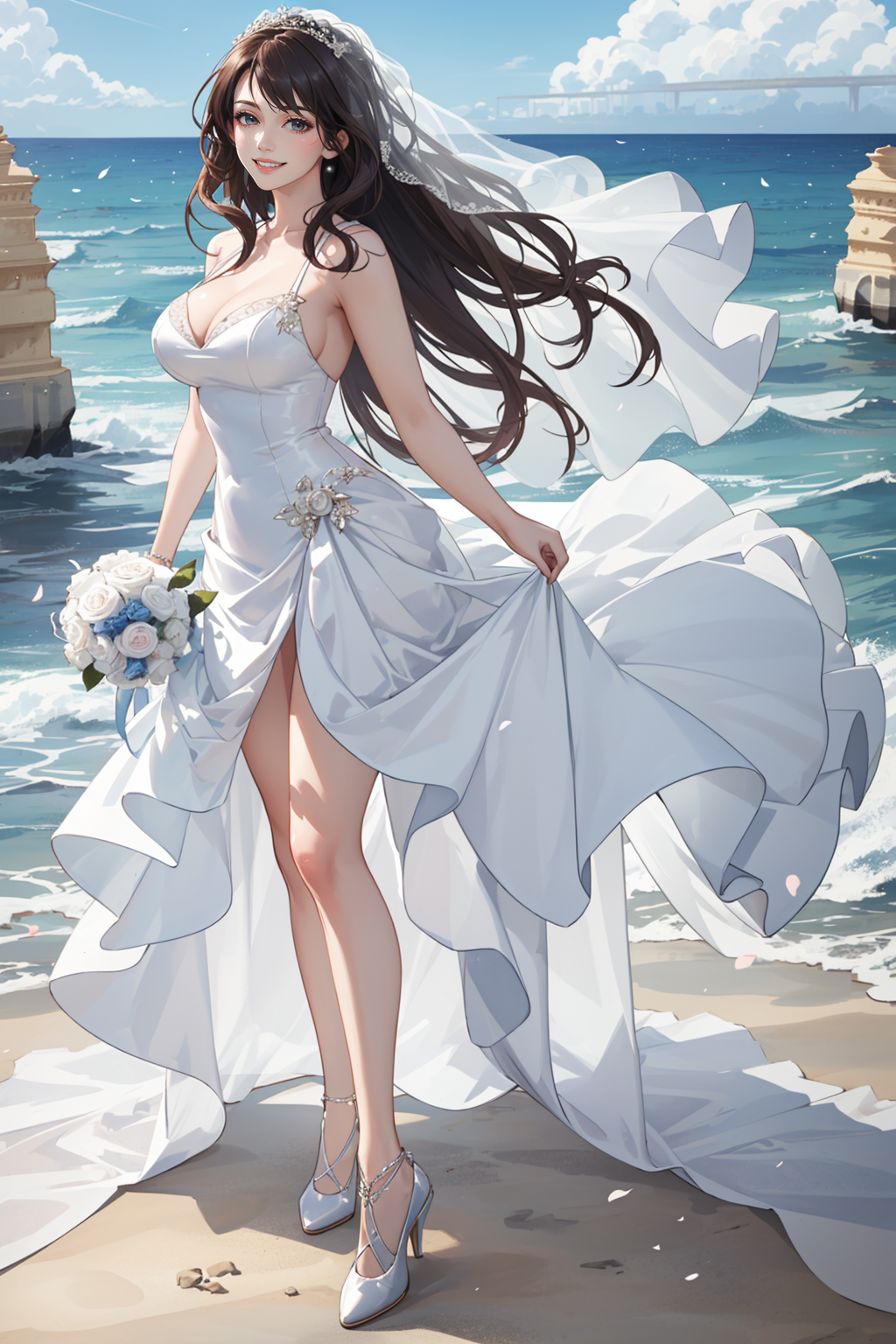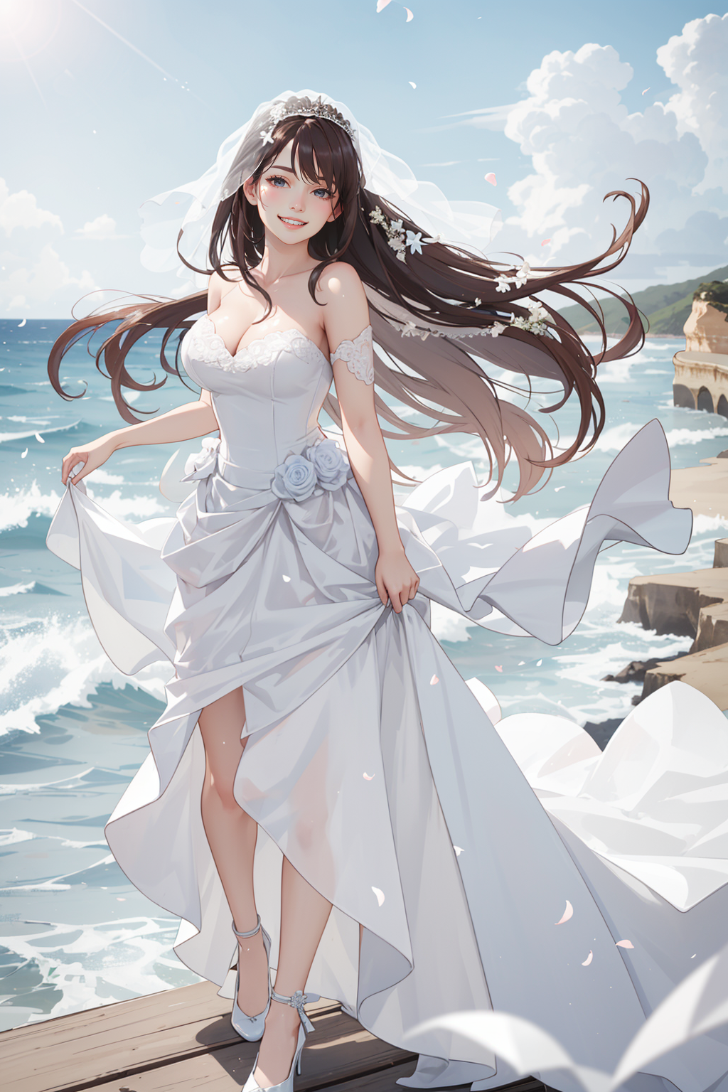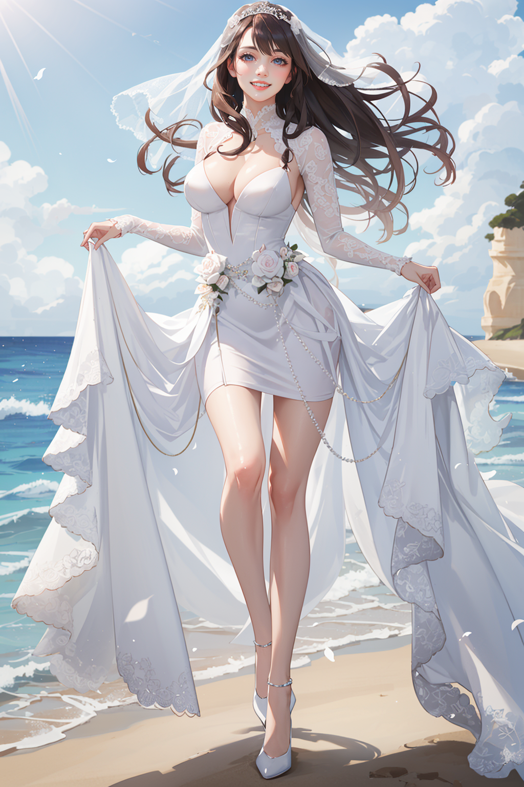 맑은 하늘에 바닷가에 웨딩드레스