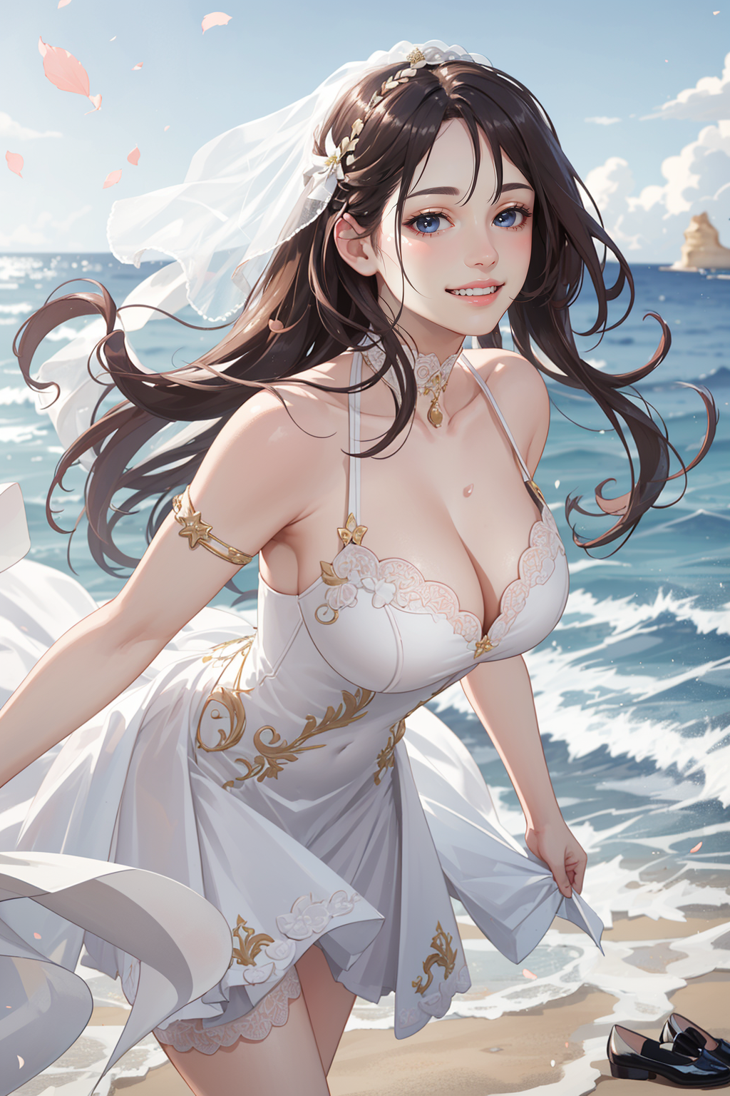 맑은 하늘에 바닷가에 웨딩드레스