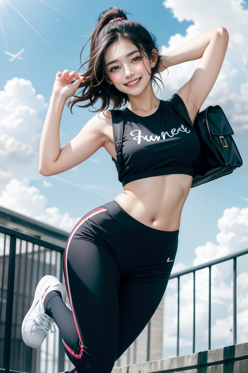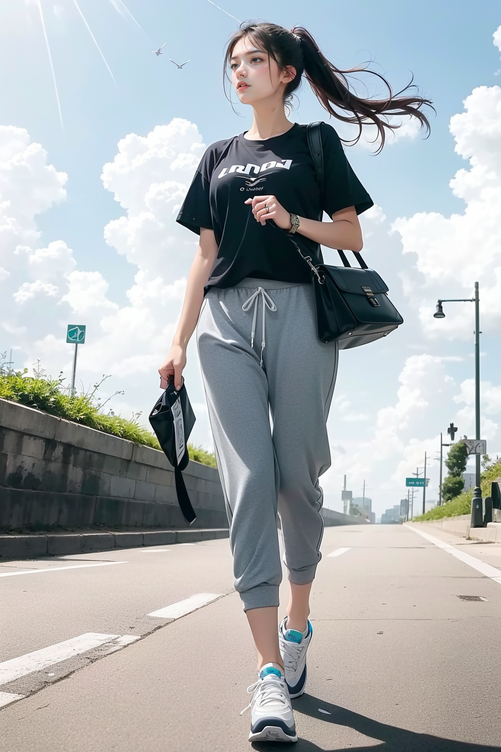 1girl,young woman, Cloud, Sky, Black T-shirt, Sweatpants, Ring, Clock, cute,beautiful,Sneakers. Black book bag,cinematic lighting, short hair, wavy hair, ponytail, medium breasts,dynamic pose,curvy, happy512, smile512,